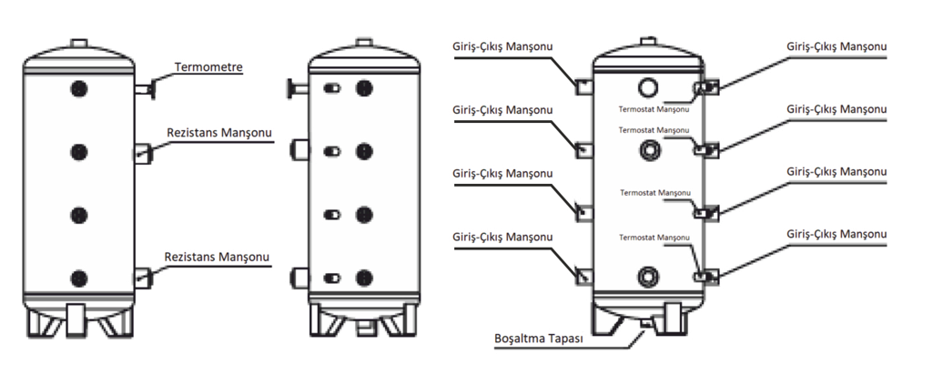 Buffer Tank Product Code: ÜBT ÜNMAK ÜBT series Buffer Tanks; It is used to store domestic hot water obtained by using central heating system, floor heating, geothermal and solar energy heating system, keeping heat loss to a minimum. Features Technicial Specifications Documents Buffer Tank ÜBT series, It is upright type. It takes up little space. It is long lasting. It is stylish and aesthetic with its modern design. It is highly efficient. It has a thermometer. It can be supported with a heater upon request. The operating pressure is 6 bar. It is insulated with polyurethane. It looks stylish with its zippered vinyl cover with sponge insert. TECHNICAL FEATURES PRODUCT TYPE ÜBT- 50 ÜBT- 100 ÜBT- 160 ÜBT- 200 ÜBT- 250 ÜBT- 300 ÜBT- 400 ÜBT- 500 ÜBT- 800 ÜBT- 1000 ÜBT- 1500 ÜBT- 2000 Rated Volume Lt 50 100 160 200 250 300 400 500 800 1.000 1.500 2.000 Real Volume Lt 56 98 162 198 238 294 390 493 791 990 1.487 1.868 Weight kg 30 51 69 77 85 101 130 154 226 260 391 447 Height mm 880 1072 1152 1302 1262 1542 1542 1790 1790 2080 1963 2363 Shell Diameter mm 427 490 590 590 647 647 750 750 980 980 1230 1230 Insulation mm 50 PU 50 PU 50 PU 50 PU 50 PU 50 PU 50 PU 50 PU 60 PU 60 PU 60 PU 60 PU Flow/Return Muff R” 1 ½" 1 ½" 1 ½" 1 ½" 1 ½" 1 ½" 1 ½" 1 ½" 2" 2" 2" 2" Number of Flow/Return Muff Piece 6 6 6 6 6 6 6 6 8 8 8 8 Sensor Connection Muff R” ½" ½" ½" ½" ½" ½" ½" ½" ½" ½" ½" ½" Number of Sensor Connection Muff Piece 3 3 3 3 3 3 3 3 4 4 4 4 Circulation Muff R” 1 ½" 1 ½" 1 ½" 1 ½" 1 ½" 1 ½" 1 ½" 1 ½" 2" 2" 2" 2" Heater Muff R” 1 ½" 1 ½" 1 ½" 1 ½" 1 ½" 1 ½" 1 ½" 1 ½" 2" 2" 2" 2" Number of Heater Muff Piece 1 1 1 1 1 1 1 1 2 2 2 2 Drain Plug R” 1 ¼" 1 ¼" 1 ¼" 1 ¼" 1 ¼" 1 ¼" 1 ¼" 1 ¼" 1 ¼" 1 ¼" 1 ¼" 1 ¼" Thermostat Muff R” ½" ½" ½" ½" ½" ½" ½" ½" ½" ½" ½" ½" PU: Polyurethane We have the right to make changes to the dimensions. Hot Water Storage Tank Catalogue User Manual of Storage Tanks Hot Water Storage Tanks TSE Certificate Hot Water Storage Tanks CE Certificate (Pressure Equipment Directive) Hot Water Storage Tanks CE Certificate (Low Voltage Directive) Hot Water Storage Tank Conformity Declaration